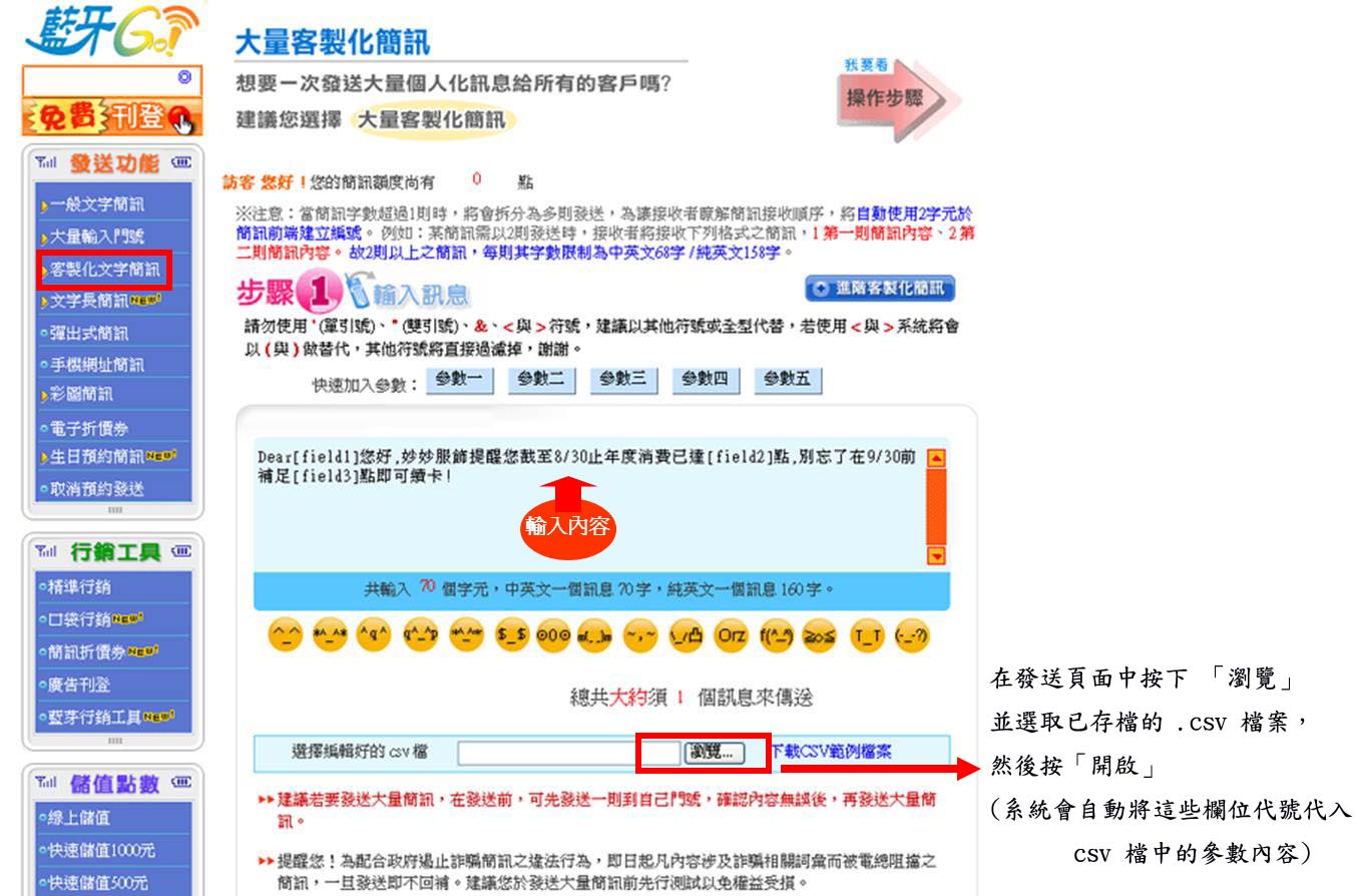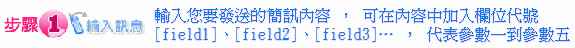 3.大量簡訊發送(2)大量客製化簡訊 → 不同內容,不同手機門號(大量客製化) 針對不同客戶在相同簡訊裡,部分文字有差異而做的設定 |