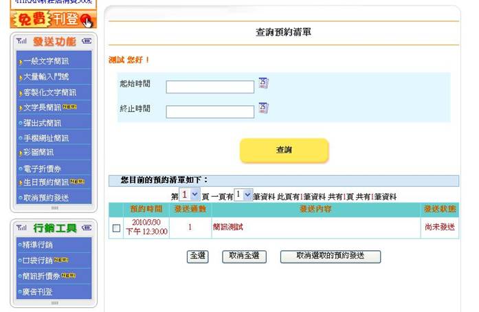 2.可依據發送帳號或發送時間,進行查詢。 |