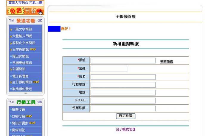 (1)新增子帳號 |