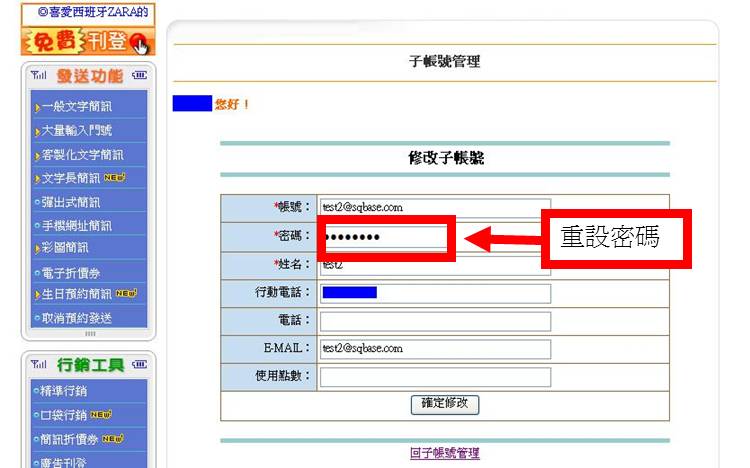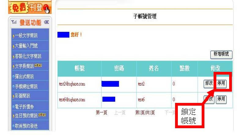 | (2)修改子帳號(可修改子帳號資料/密碼重新設定與使用點數) | ||||||