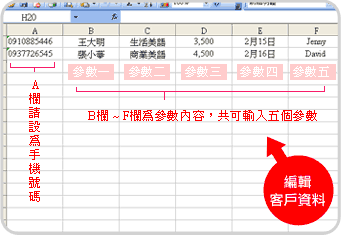◎A欄請設為手機號碼 ◎B欄 ~ F欄為參數內容 共可輸入五個 參數